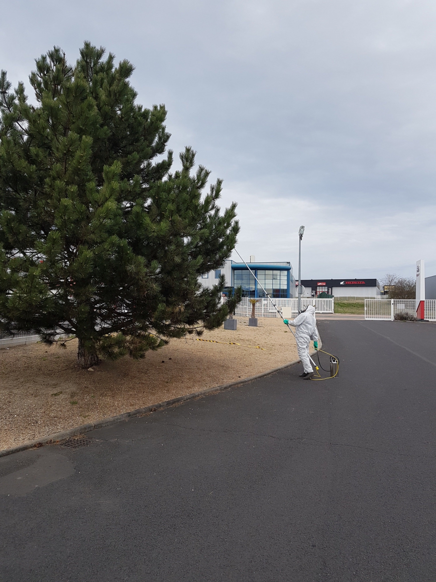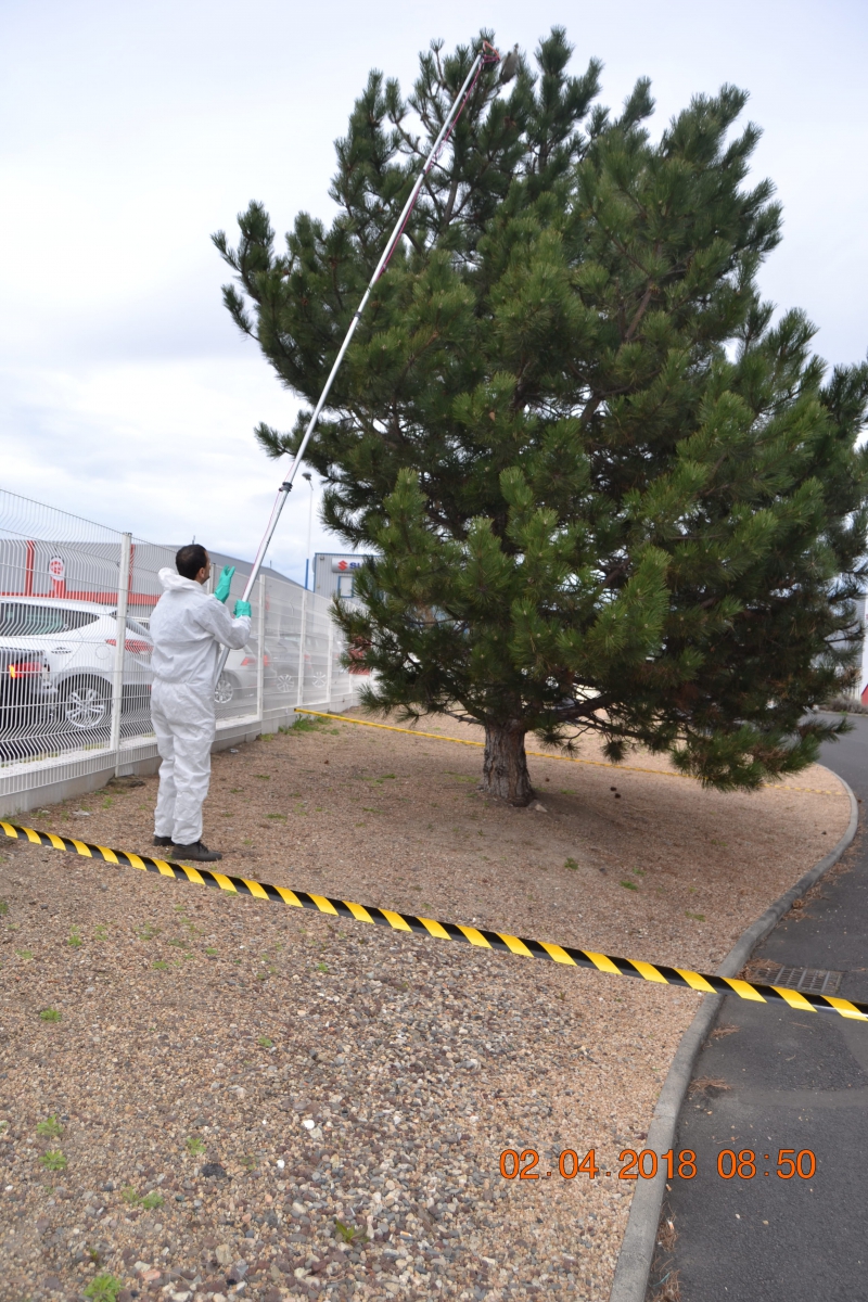 Le traitement de l'arbre contre les chenilles processionnaires est un traitement biologique par la pulvérisation d'une solution à base d'une bactérie Bacillus thuringiensis (BTK) sur les épines de pin. Agit par ingestion, spécifique des larves de lépidoptères et il ne présente aucun danger pour l'homme ou les animaux. Pour réaliser le traitement faut avoir minimum 3 jours de beau temps sans pluie et sans vent pour réussir l'opération. Le traitement doit être appliquer juste après l'eclosion (début de l'automne) et il ne sert à rien de l'appliquer en hiver ou en printemps sur les arbres de pins.